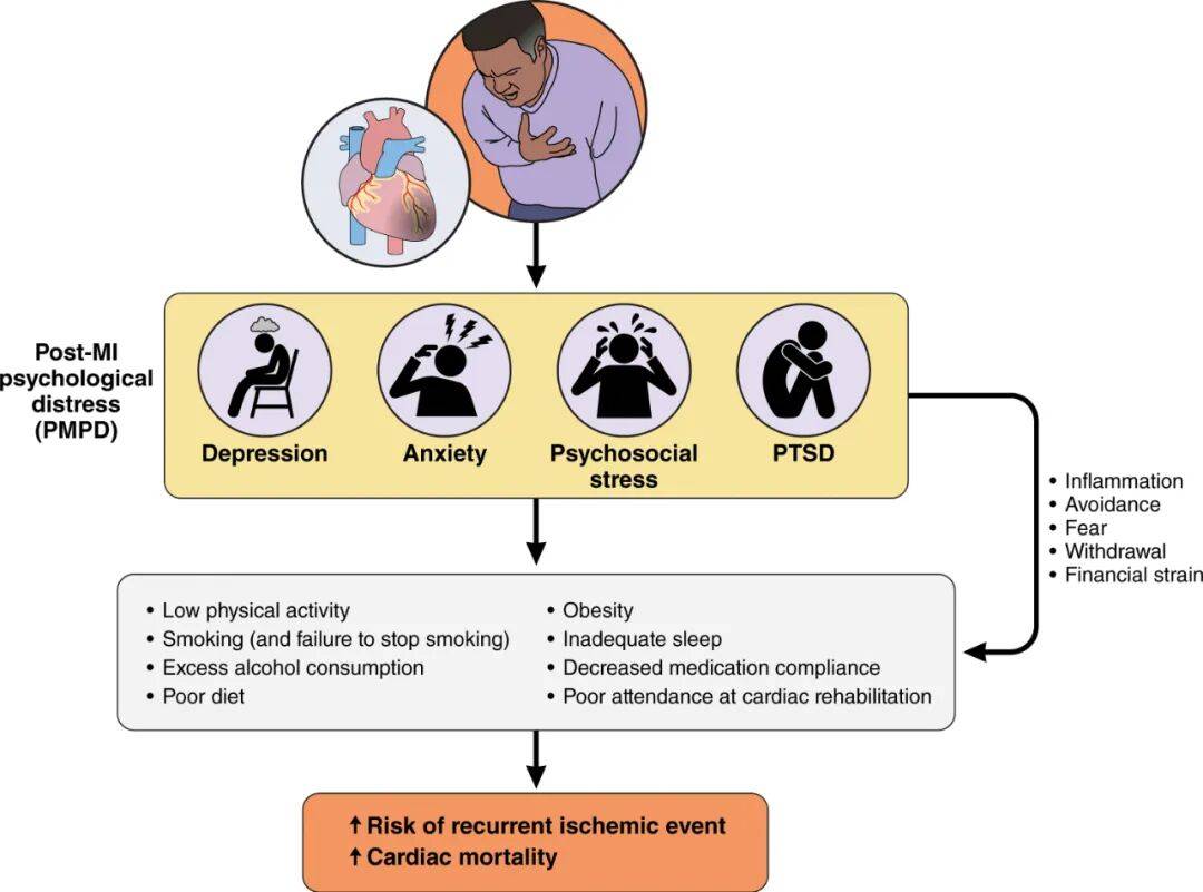 近日,美国心脏协会(AHA)发布科学声明指出,多达一半的心梗后患者可能会经历某种形式的心理困扰(psychological distress),包括抑郁、焦虑、心理社会应激、创伤后应激障碍,而心梗后心理困扰(PMPD)与不良心脏事件复发风险增加相关。