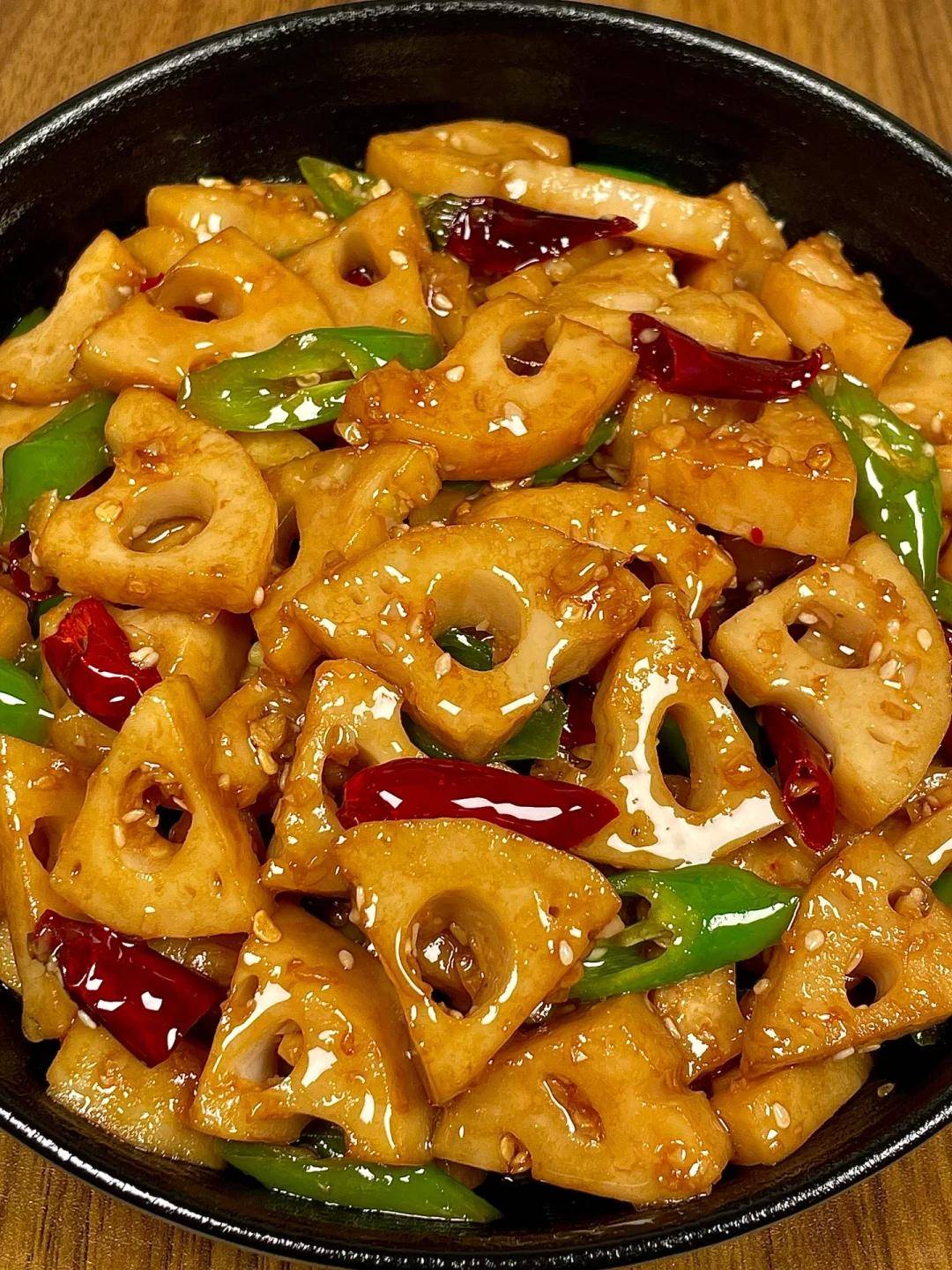 锅中倒入适量食用油,油热吼倒入蒜末、干辣椒爆香,再把莲藕倒入锅中翻炒,加入1勺蚝油、陈醋、2勺生抽、少许盐调味,再把辣椒倒入锅中翻炒即可。