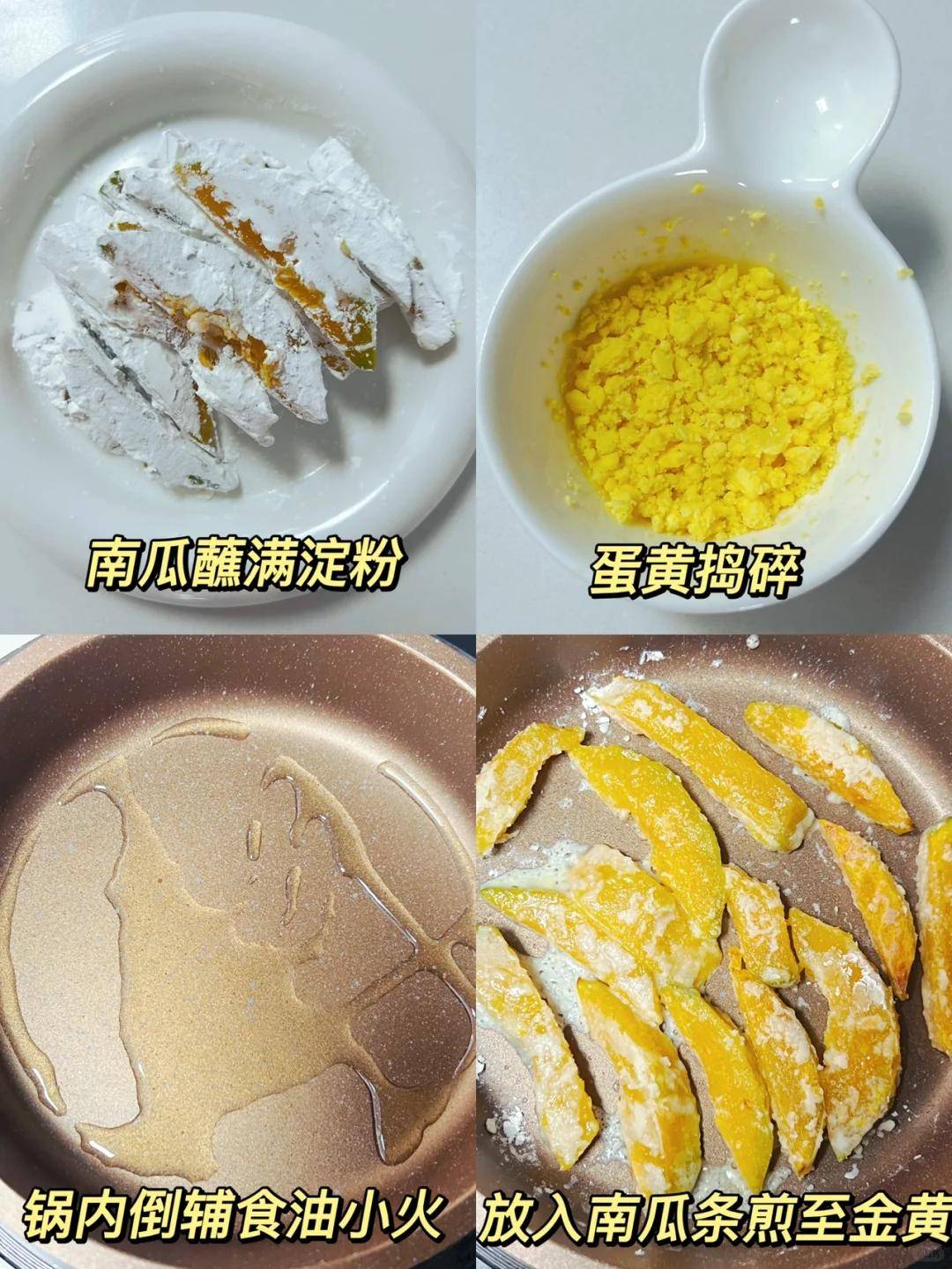 蒸好的南瓜上面蘸满淀粉,再把刚才煮好的鸡蛋蛋黄拿出来,把蛋黄碾碎,锅中倒入适量食用油,把南瓜条煎至两面金黄的状态。