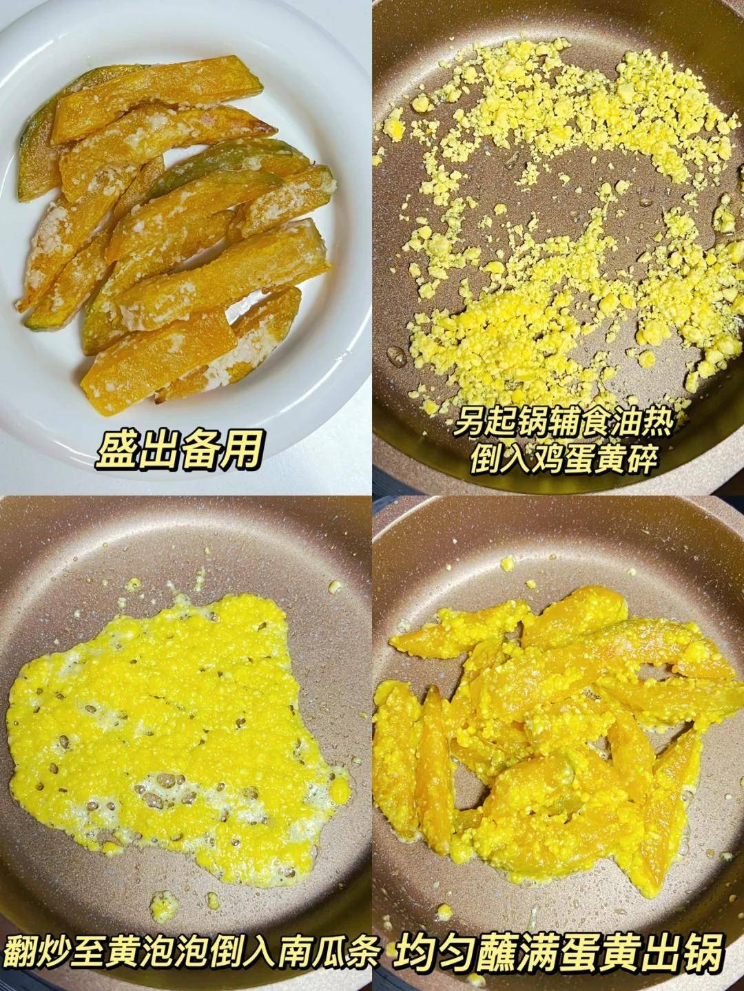 煎好的南瓜条盛出来,锅中倒入适量食用油,把鸡蛋黄倒入锅中翻炒至出现黄泡泡,再把南瓜条倒进去继续炒,每根南瓜都沾满蛋黄就可以出锅了。