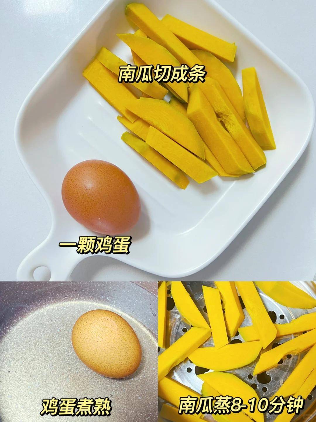 先把南瓜切成条,准备好鸡蛋,把鸡蛋煮熟,南瓜上锅蒸8~10分钟左右。
