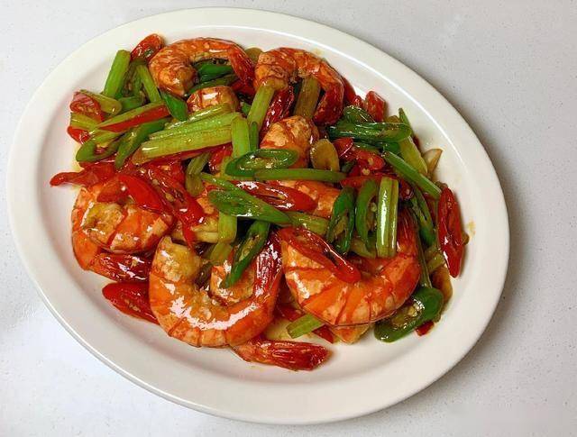 材料:虾 300克;芹菜 100克;干辣椒 适量;大蒜 3瓣;姜片 适量;生抽 适量;料酒 适量;白糖 适量;食用油 适量;盐 适量;辣椒粉 适量