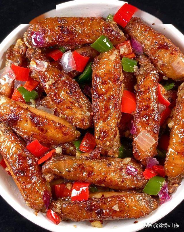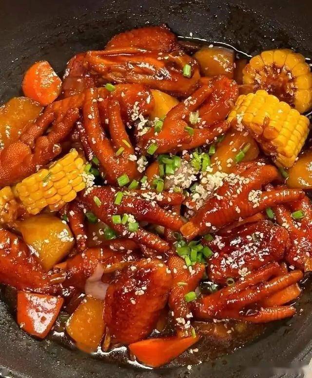 3.冰糖炒枣红色,倒鸡翅鸡爪上色,加豆瓣酱、酱汁炒匀,倒半瓶啤酒和清水没过食材,焖20分钟。加配菜再焖15分钟,放洋葱收汁,撒葱花白芝麻。