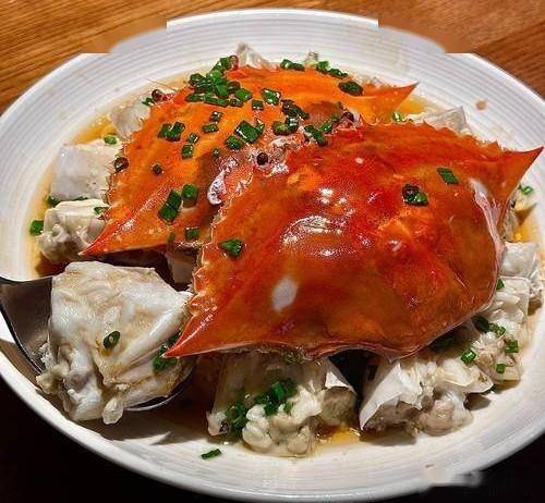 螃蟹蒸好后,淋上葱油和一圈鱼豉油,即可上桌。