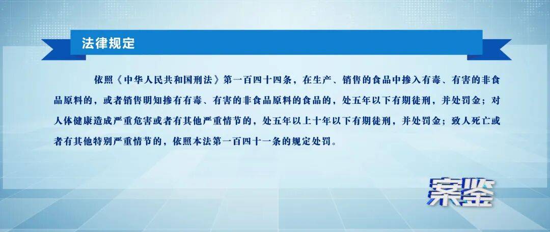 依照《中华人民共和国刑法》第一百四十四条,在生产、销售的食品中掺入有毒、有害的非食品原料的,或者销售明知掺有有毒、有害的非食品原料的食品的,处五年以下有期徒刑,并处罚金;对人体健康造成严重危害或者有其他严重情节的,处五年以上十年以下有期徒刑,并处罚金;致人死亡或者有其他特别严重情节的,依照本法第一百四十一条的规定处罚。
