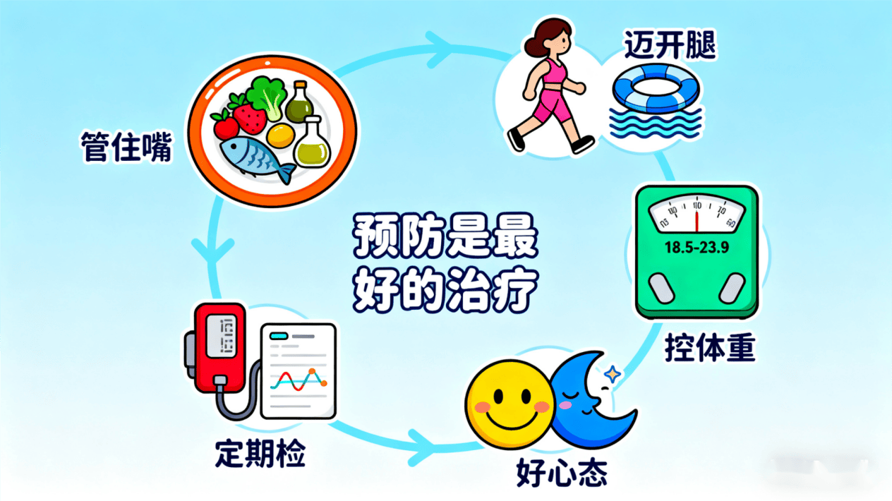 定期检:40岁以上人群应每年检查血压、血糖、血脂,做到早发现、早干预。