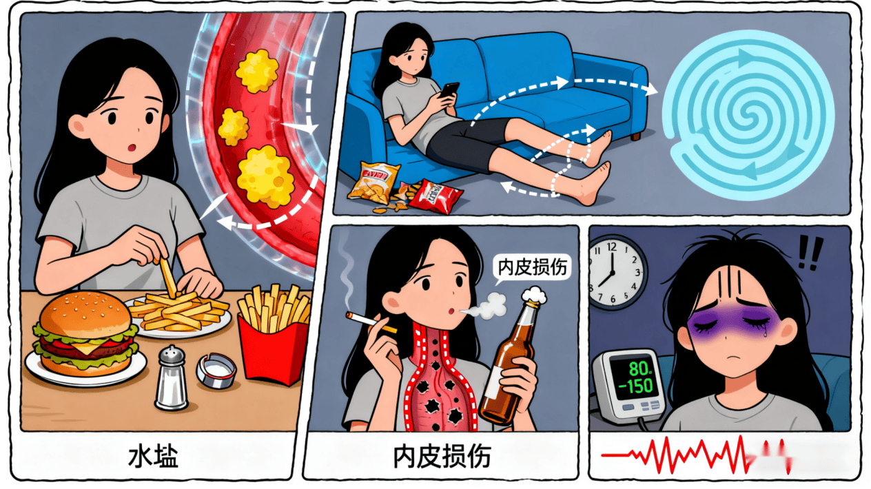 吸烟酗酒:烟草中的尼古丁等有害物质会直接损伤血管内皮,加速动脉硬化。酒精则会升高血压,加重心脏负担。