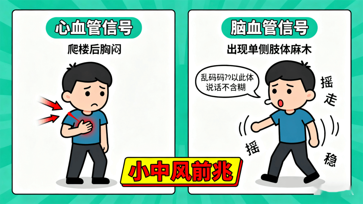 脑血管信号:一过性的头晕、眼前发黑;短暂出现肢体麻木、无力,尤其是单侧;说话含糊不清;行走不稳。这些可能是“小中风”(短暂性脑缺血发作)的表现,是重大脑梗的前兆。