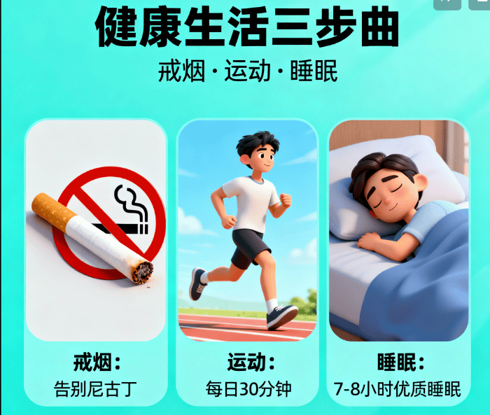 每周至少5天、每天30分钟的中等强度运动,如快走、慢跑、游泳等。运动能帮助控制体重、改善血液循环、降低血脂和血压。记住"运动就像刷牙,不是一天的事,而是一辈子的事"。