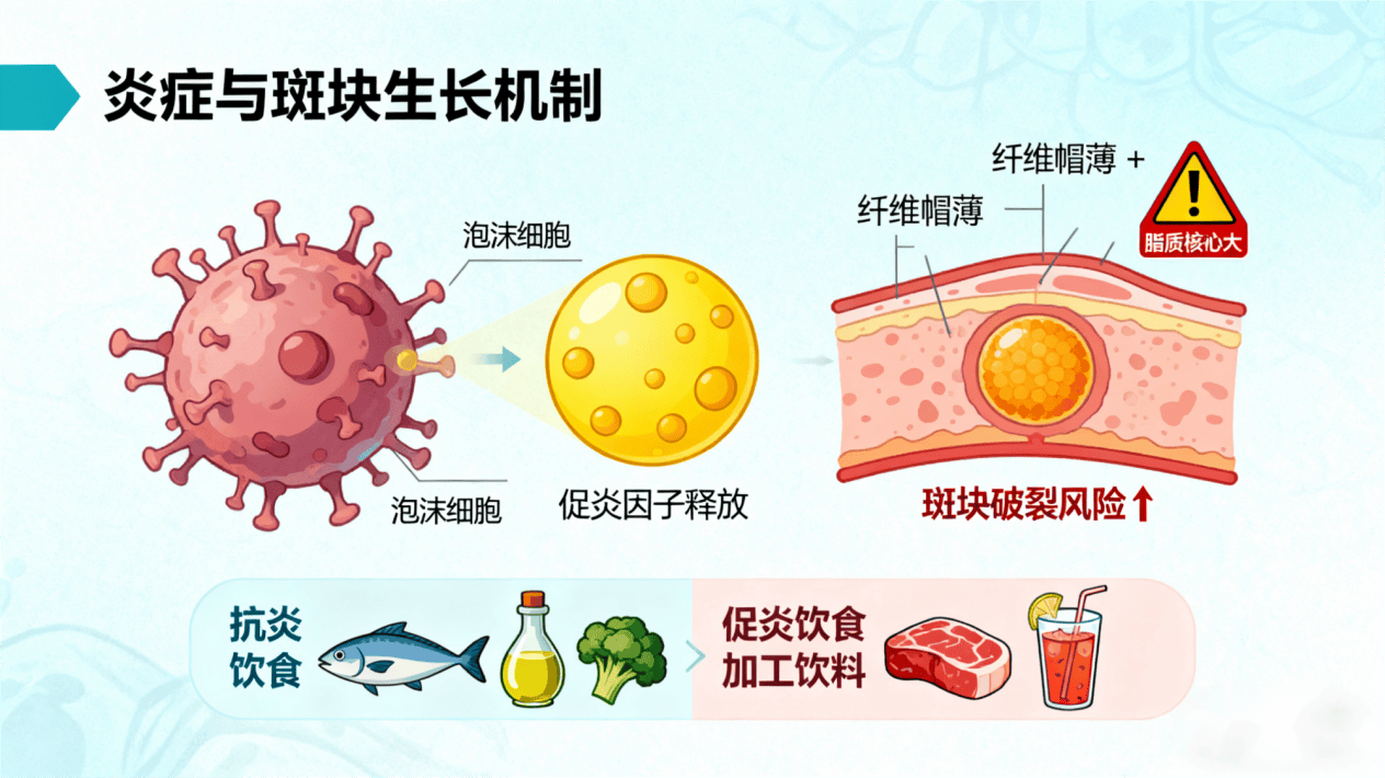 很多人不知道,动脉粥样硬化其实是一种“慢性炎症疾病”。从血管内皮有伤口,到坏血脂氧化,再到泡沫细胞堆积,每一步都有炎症反应。就像皮肤受伤后会红肿、发炎一样,血管内皮受损后,也会释放炎症因子,吸引更多免疫细胞聚集,进一步加重血管损伤,让斑块长得更快、更不稳定。