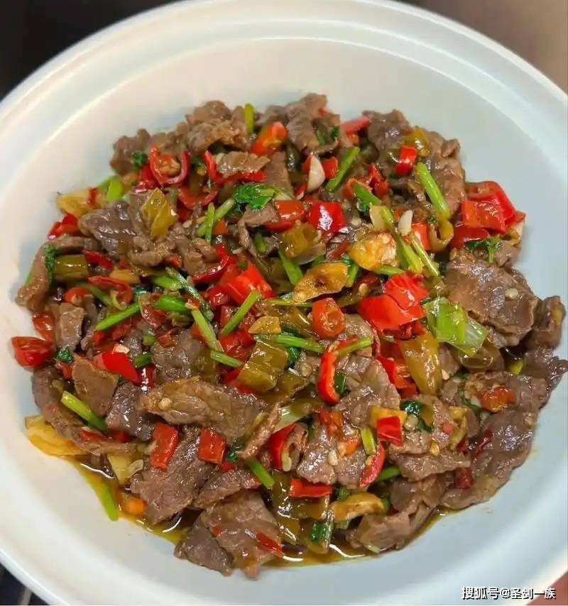 6. 牛肉回锅,旺火翻炒15秒,让辣味裹满肉片,尝味补少许盐。
