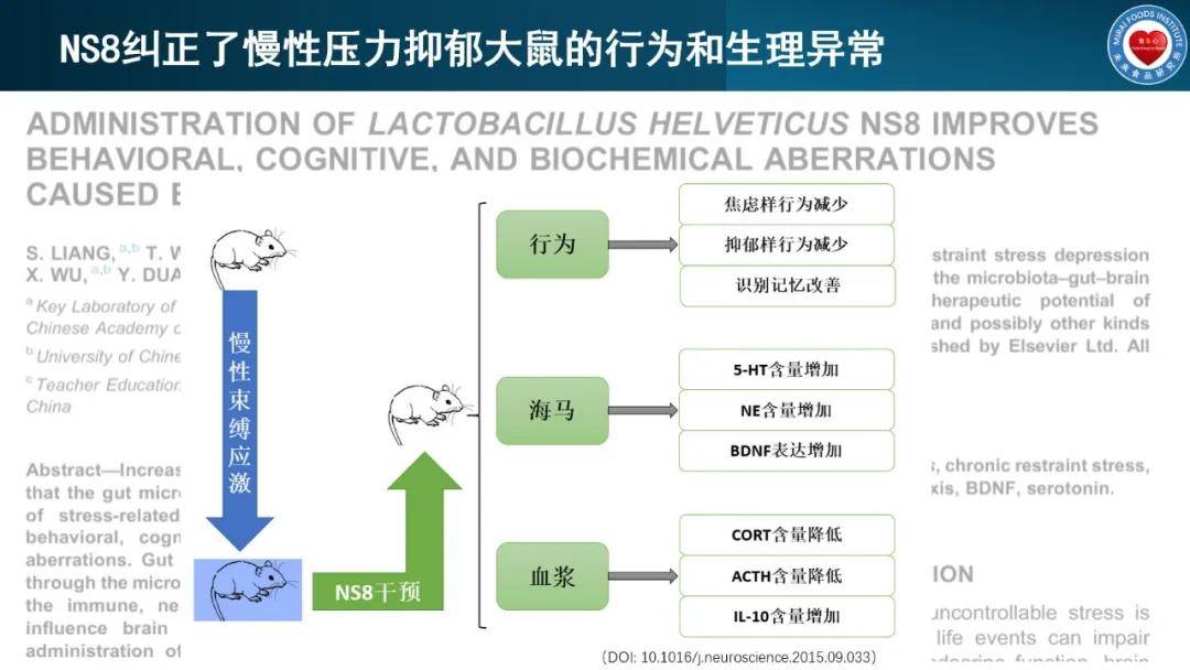 3周的瑞士乳杆菌NS8干预就足以扭转慢性应激造成的大鼠抑郁行为、焦虑行为、和记忆力损伤,免疫异常、神经内分泌异常、以及神经异常。
