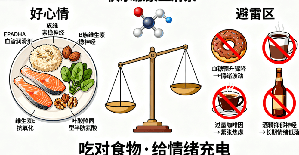 饮食也会悄悄影响情绪:有些食物能帮你镇定神经,有些却可能加剧焦虑,学会 “选对吃的” 很重要。