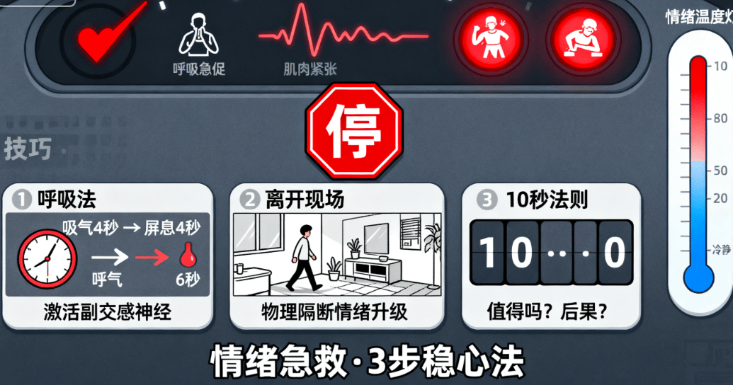 情绪激动时,及时 “踩刹车” 至关重要。分享一套简单实用的 “情绪急救法”,帮你快速稳住心态: