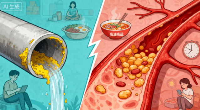 特别是现在很多人喜欢高油高盐的外卖、久坐不爱运动、经常熬夜,这些都在给血管“添堵”。时间一长,血管通道越来越窄,血流自然就不通畅了。