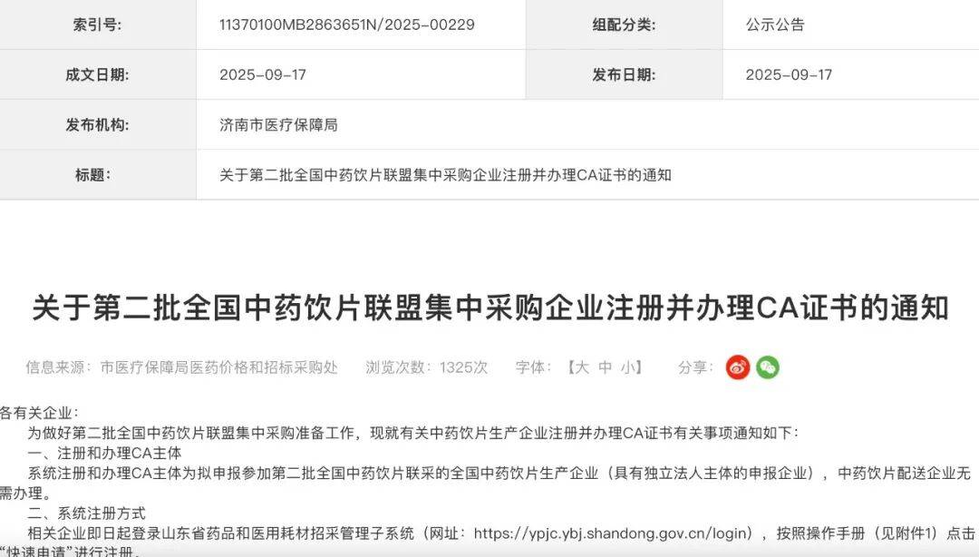 9月中旬,山东省医保局发出《关于第二批全国中药饮片联盟集中采购企业注册并办理CA证书的通知》。