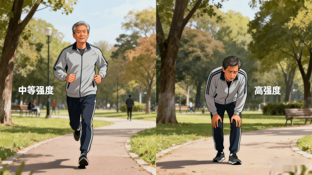 中等强度:运动时心跳加速,微微出汗,呼吸略促但仍能进行简短对话。