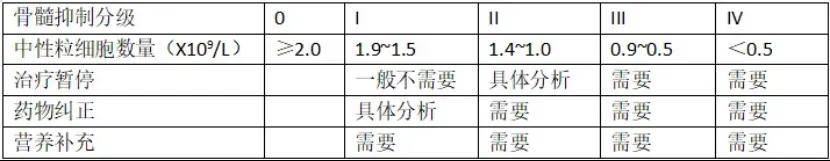 处理骨髓抑制造成的中性粒细胞下降,需要考虑三方面:治疗暂停、药物纠正、营养补充。