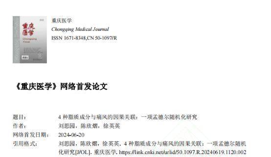 [1]刘思园.4种脂质成分与痛风的因果关联:一项孟德尔随机化研究,重庆医学,2024-06-20