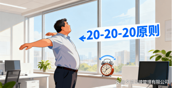 打破连续静坐:遵循“20-20-20”原则,即每坐20分钟,就站起来活动20秒,并远眺20英尺(约6米)以外。这是最有效的方法。