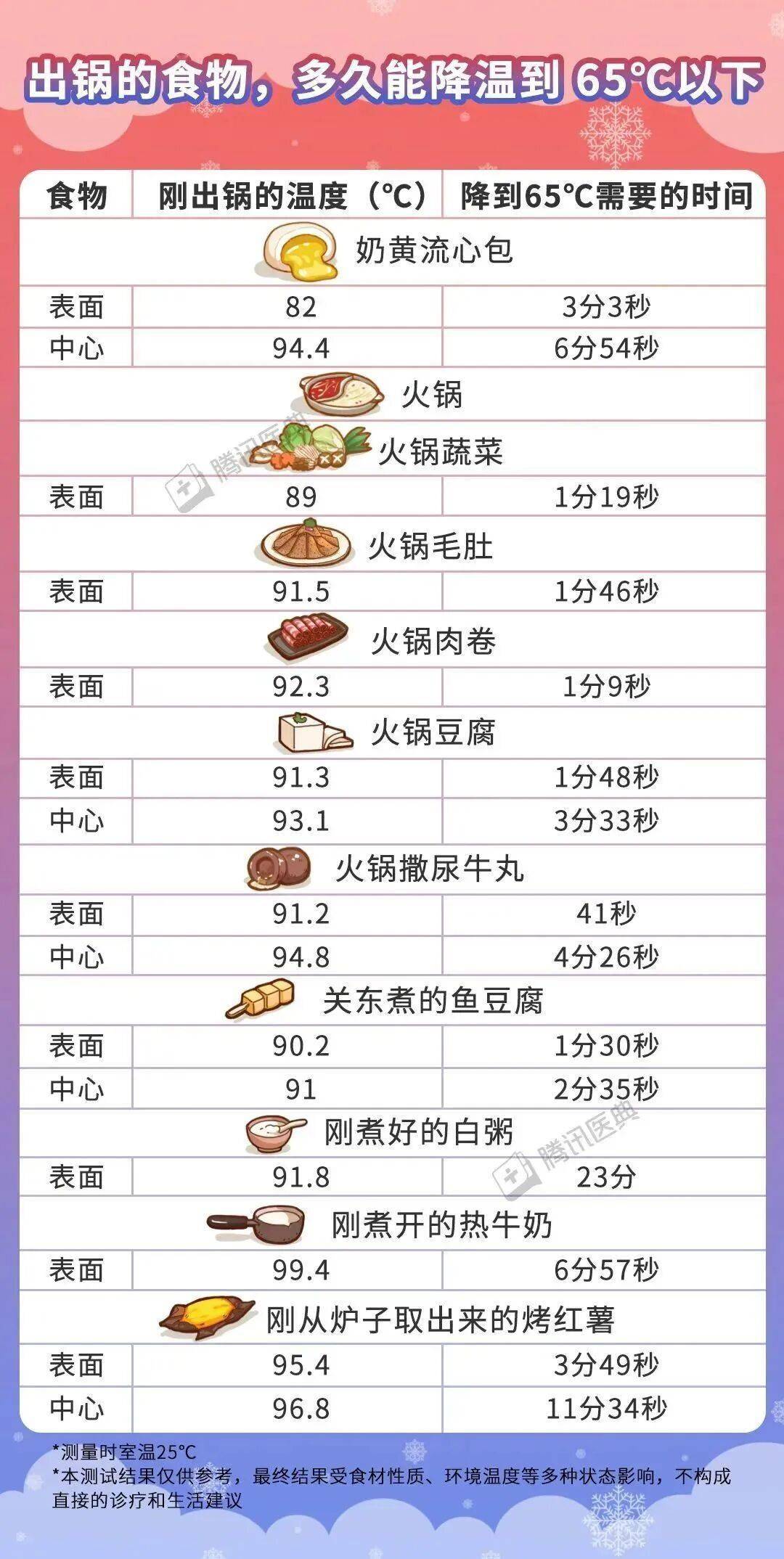 因此,可以参考下图所示的各种不同食物的出锅温度,以及降到 65℃所需的时间。