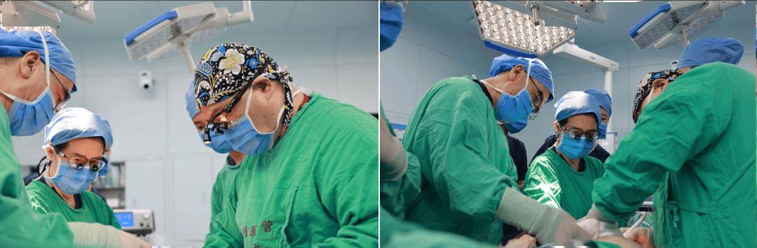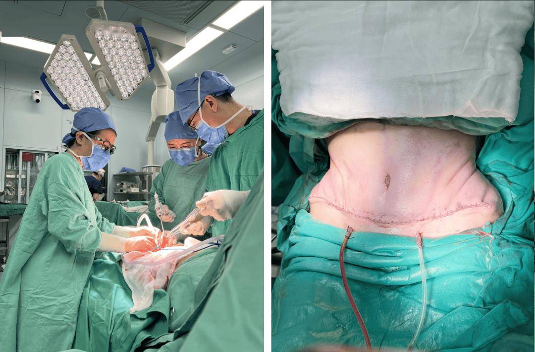 副主任医师周芳及腹壁成型团队为林女士实施腹壁成型手术(左),术后即刻显现“双C腰”与“马甲线”(右)