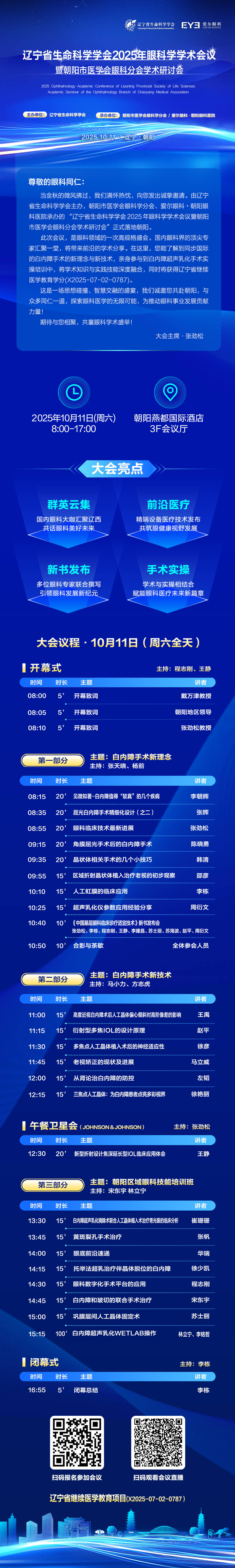 相信在强大医资力量的支撑下,在李栋教授、程志刚院长的带领下,通过积极参与学术交流、深化跨区域协作、持续推动技术创新,爱尔眼科・朝阳眼科医院必将在未来取得更辉煌的成就,成为区域眼科学术与医疗领域的璀璨明珠。此次学术会议,不仅是医院展示技术实力与协作成果的平台,更将成为推动区域白内障诊疗水平提升的重要契机。让我们共同期待,医院在此次会议后开启全新发展篇章,在眼科学领域创造更多精彩,为广大眼病患者带来光明与希望,为推动我国眼健康事业发展作出更大贡献。