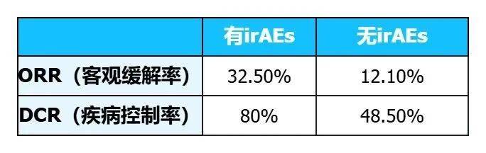 发生irAEs的患者在客观缓解率(ORR)和疾病控制率(DCR)方面要优于未发生irAEs的患者。