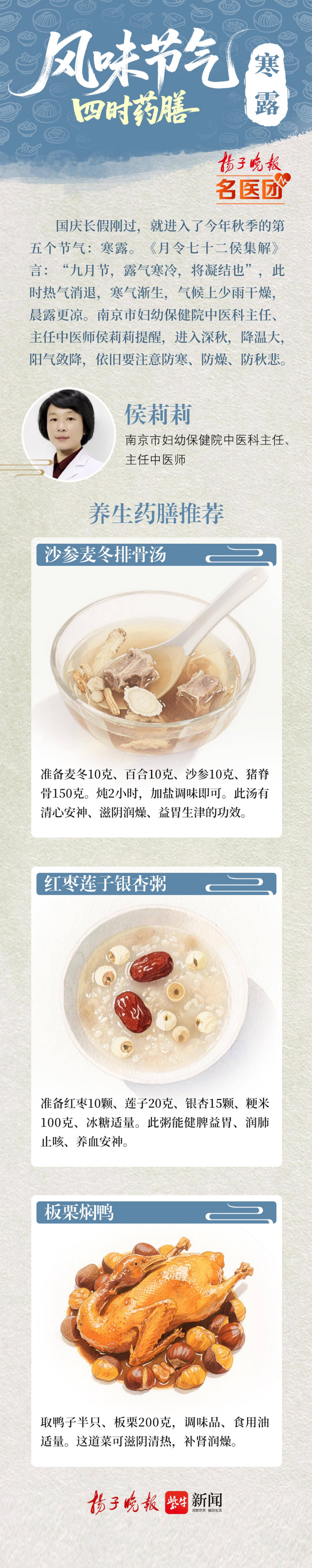 10月8日,就进入了今年秋季的第五个节气:寒露。《月令七十二侯集解》言:“九月节,露气寒冷,将凝结也”,此时热气消退,寒气渐生,气候上少雨干燥,晨露更凉。南京市妇幼保健院中医科主任、主任中医师侯莉莉提醒,进入深秋,降温大,阳气敛降,依旧要注意防寒、防燥、防秋悲。