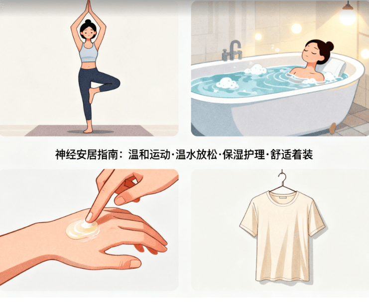 做好皮肤 “保湿防护”:干燥会加重皮肤不适,每天洗澡后用温和的润肤露涂遍全身,尤其四肢末梢;穿衣服尽量选纯棉、宽松的款式,减少对皮肤的摩擦,避免化纤、紧身衣物带来的刺激。