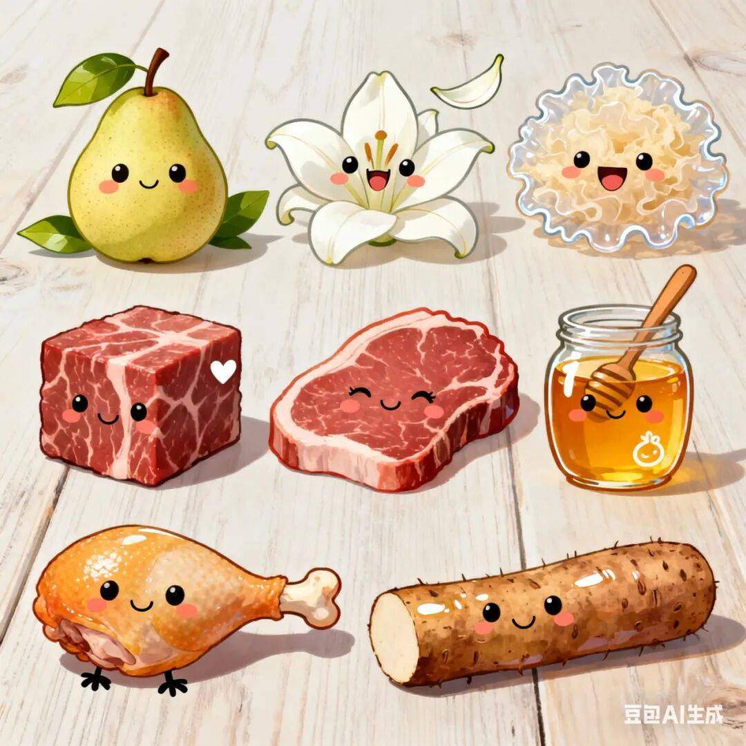 滋阴润燥类:梨、百合、银耳、蜂蜜、莲子、芝麻、核桃等。梨有润肺止咳、清热生津的功效,可生吃或煮成梨汤;百合能养阴润肺、清心安神,可与莲子、银耳一起煮粥或煲汤。