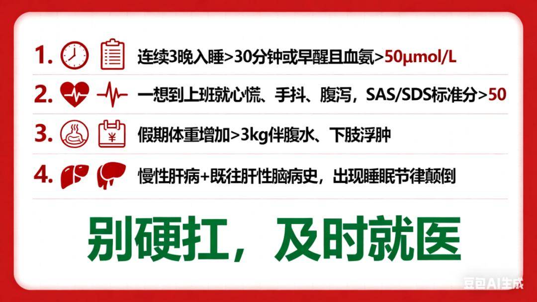 • 肝硬化患者:假期熬夜+高盐零食→腹水、血氨双升→出现昼夜颠倒、计算力下降,可能是轻微肝性脑病,第一时间查血氨而非盲目吃安眠药!