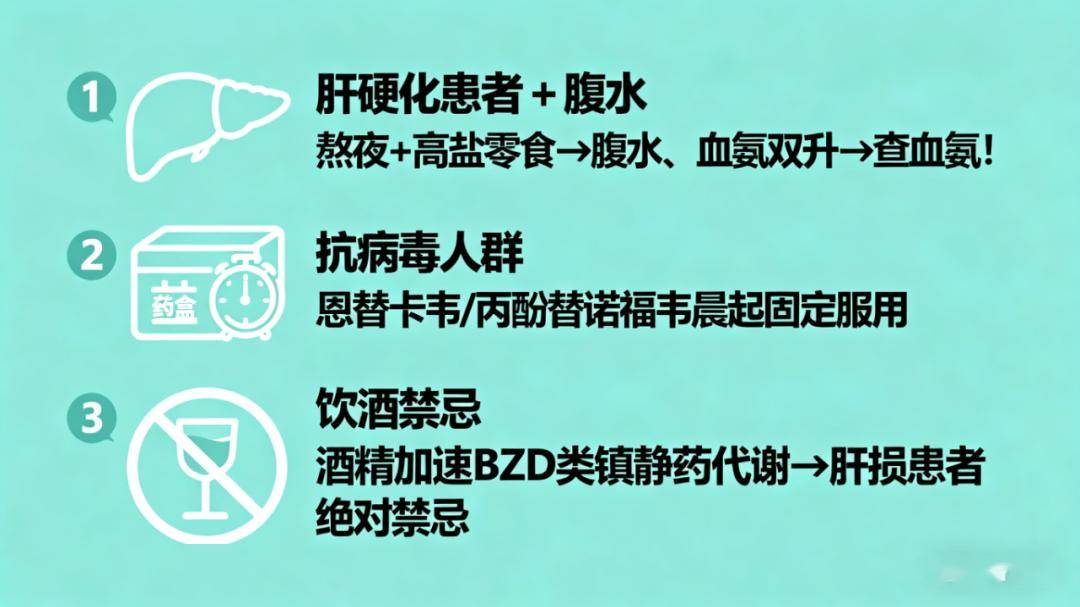 • 饮酒零容忍:酒精加速BZD类镇静药代谢,增加呼吸抑制风险,肝损患者绝对禁忌。