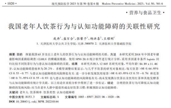 [1] 我国老年人饮茶行为与认知功能障碍的关联性研究戚冉., 现代预防医学 ,2023-03-25