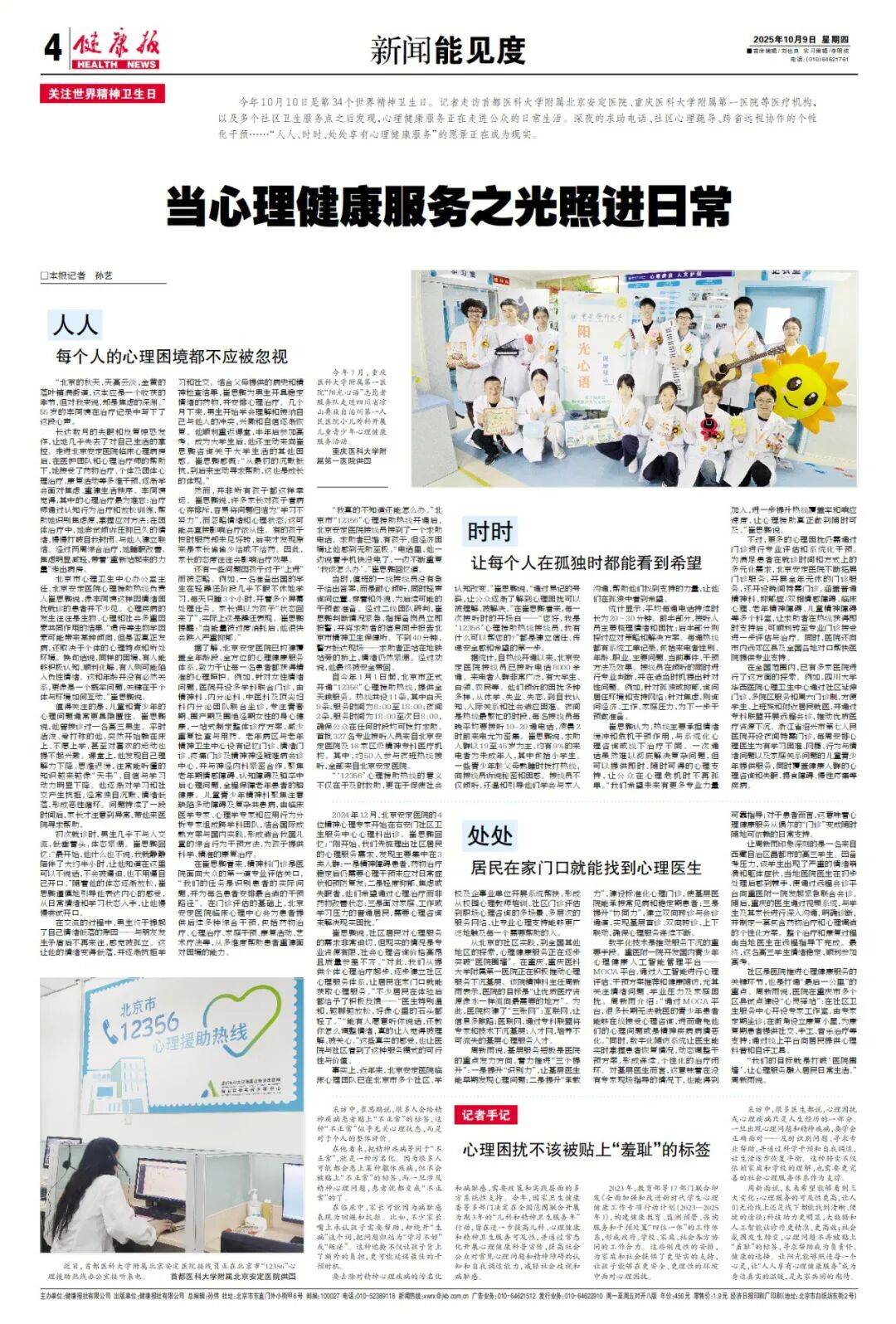 今年10月10日是第34个世界精神卫生日。记者走访首都医科大学附属北京安定医院、重庆医科大学附属第一医院等医疗机构,以及多个社区卫生服务点之后发现,心理健康服务正在走进公众的日常生活。深夜的求助电话、社区心理疏导、跨省远程协作的个性化干预……“人人、时时、处处享有心理健康服务”的愿景正在成为现实。
