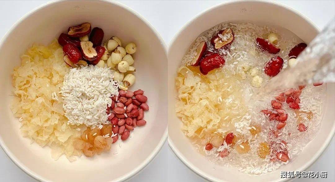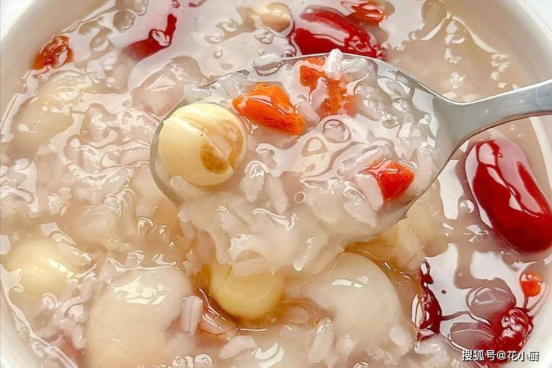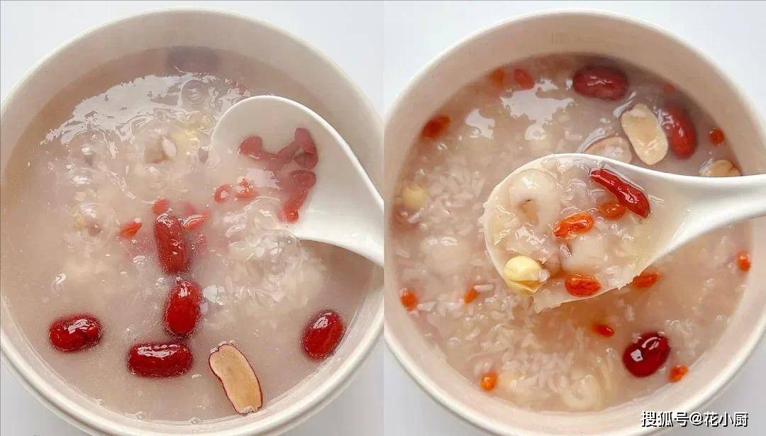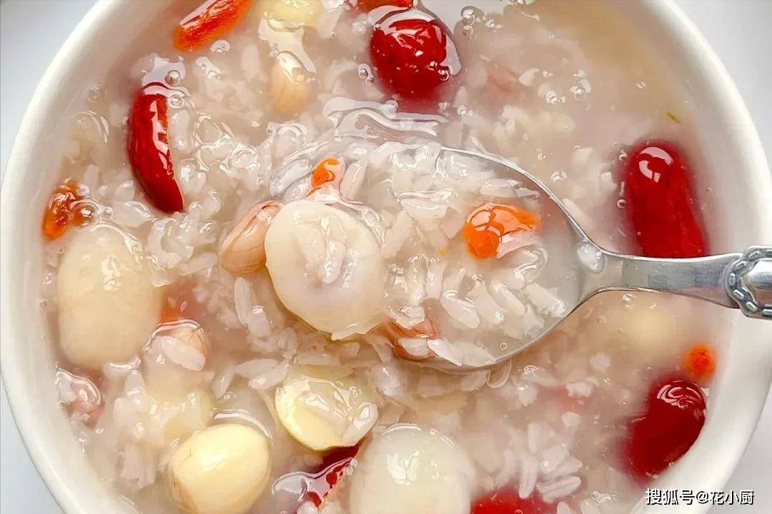 莲子能养心安神,桂圆可是补血的好东西,花生富含营养,糯米能健脾暖胃,银耳滋润皮肤,红枣就更不用说了,补气血一绝,枸杞则能养肝明目。这么多好东西凑一块儿,熬出来的粥能不好喝、没效果吗?