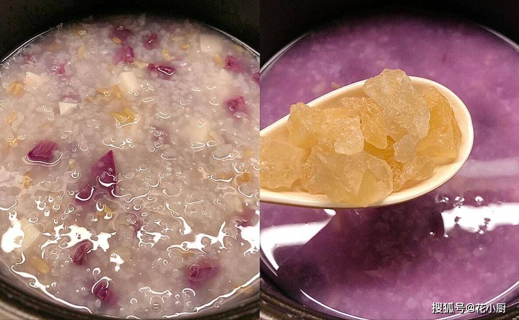 食材:大米50克、糯米50克、燕麦20克、山药去皮后50克、紫薯去皮后70克、清水800毫升、冰糖适量