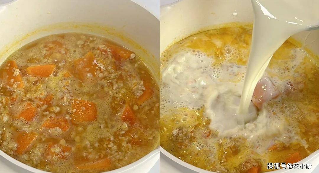 3、最后一步,就是倒入适量的牛奶。等粥煮了 5 分钟后,打开锅盖,把牛奶倒进去。牛奶一倒进去,那香味一下子就飘出来了,闻着就特别诱人。再用勺子搅拌搅拌,让牛奶和粥充分融合。这时候你会发现,原本颜色有点单调的粥,因为加入了牛奶,变得白白黄黄的,看起来就很有食欲。
