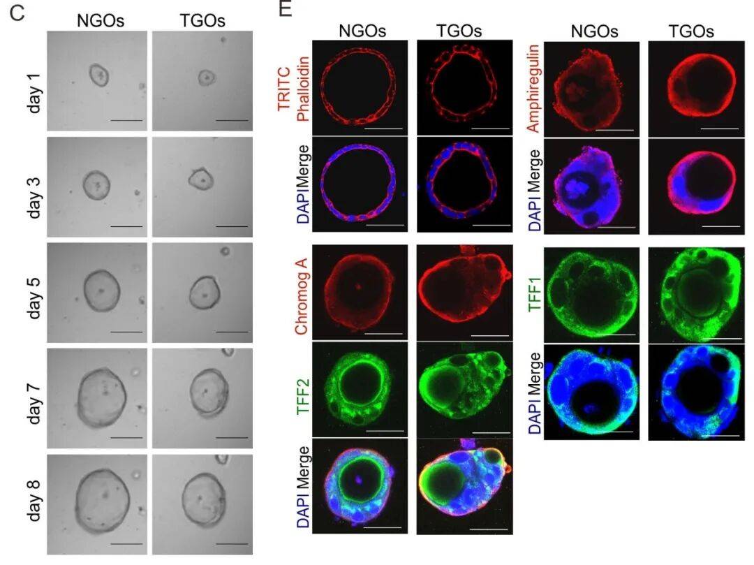 结果显示,胃类器官无论来源如何,均呈球形,生长模式无显著差异(图1C)。检测胃粘膜固有细胞类型相关基因表达,发现NGO和TGO均能有效表达胃粘液细胞特异性生物标志物,且未发生肠化生。胃类器官具有球形结构,单层细胞内衬内部和中央管腔,能执行胃腺功能(图1E)。