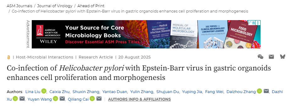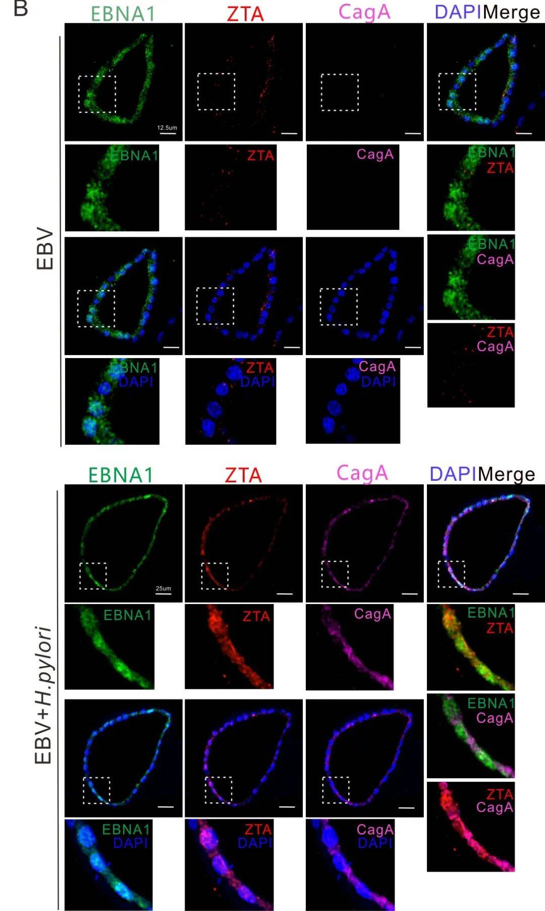 Liu L, Zhu C, Zhang S, Duan Y, Zhang Y, Du S, Jia Y, Wei F, Zhang D, Xu D, Wang Y, Cai Q. Co-infection of Helicobacter pylori with Epstein-Barr virus in gastric organoids enhances cell proliferation and morphogenesis. J Virol. 2025 Aug 20:e0092825. doi: 10.1128/jvi.00928-25.