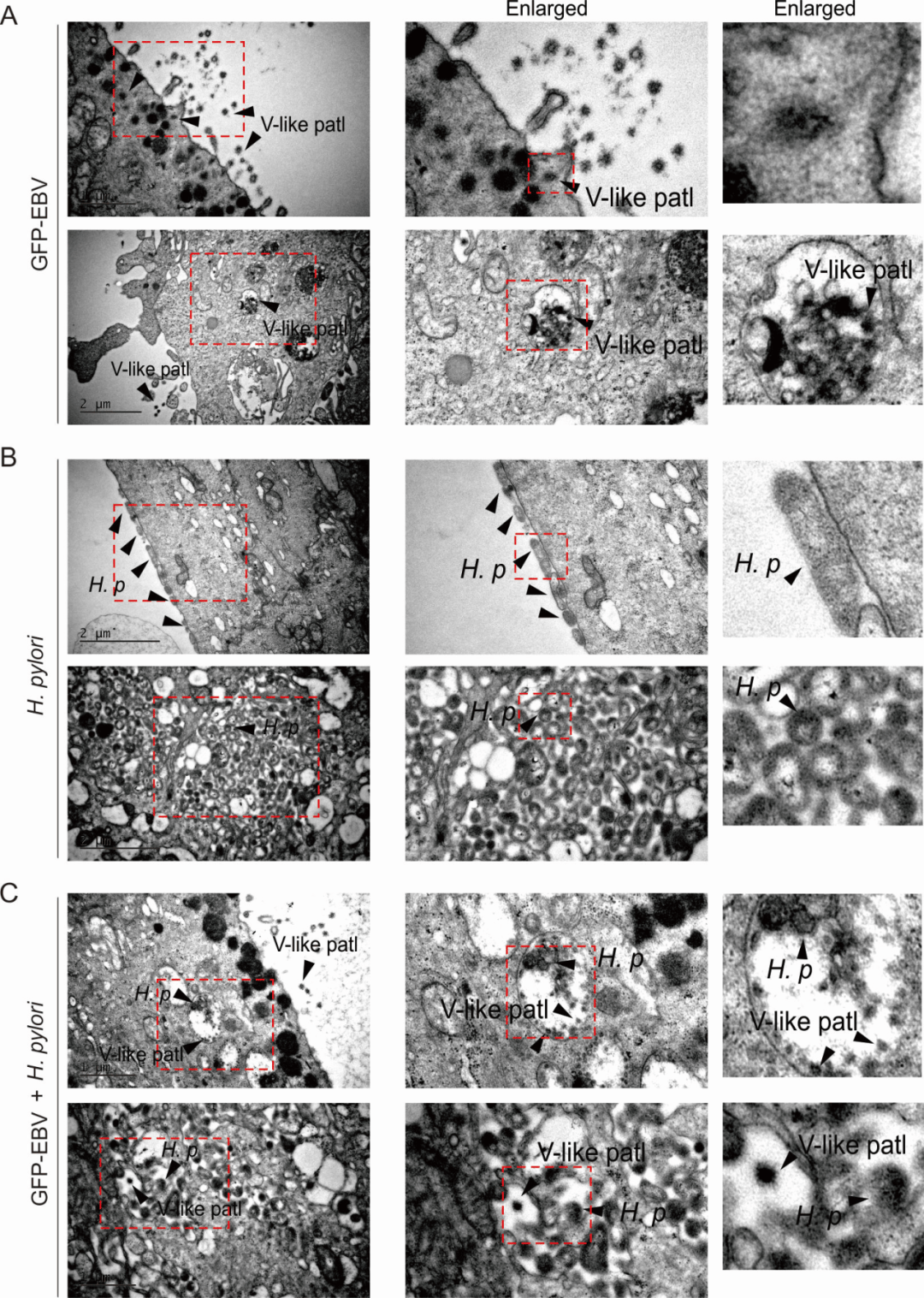 透射电子显微镜进一步证实了这一现象,揭示了EBV样颗粒与幽门螺杆菌细胞在类器官顶端表面的共定位,以及联合感染组中NGO积累的微绒毛和酶颗粒。这些结果初步表明幽门螺杆菌与EBV共感染可能增强幽门螺杆菌与胃上皮的关联(图5A-C)。