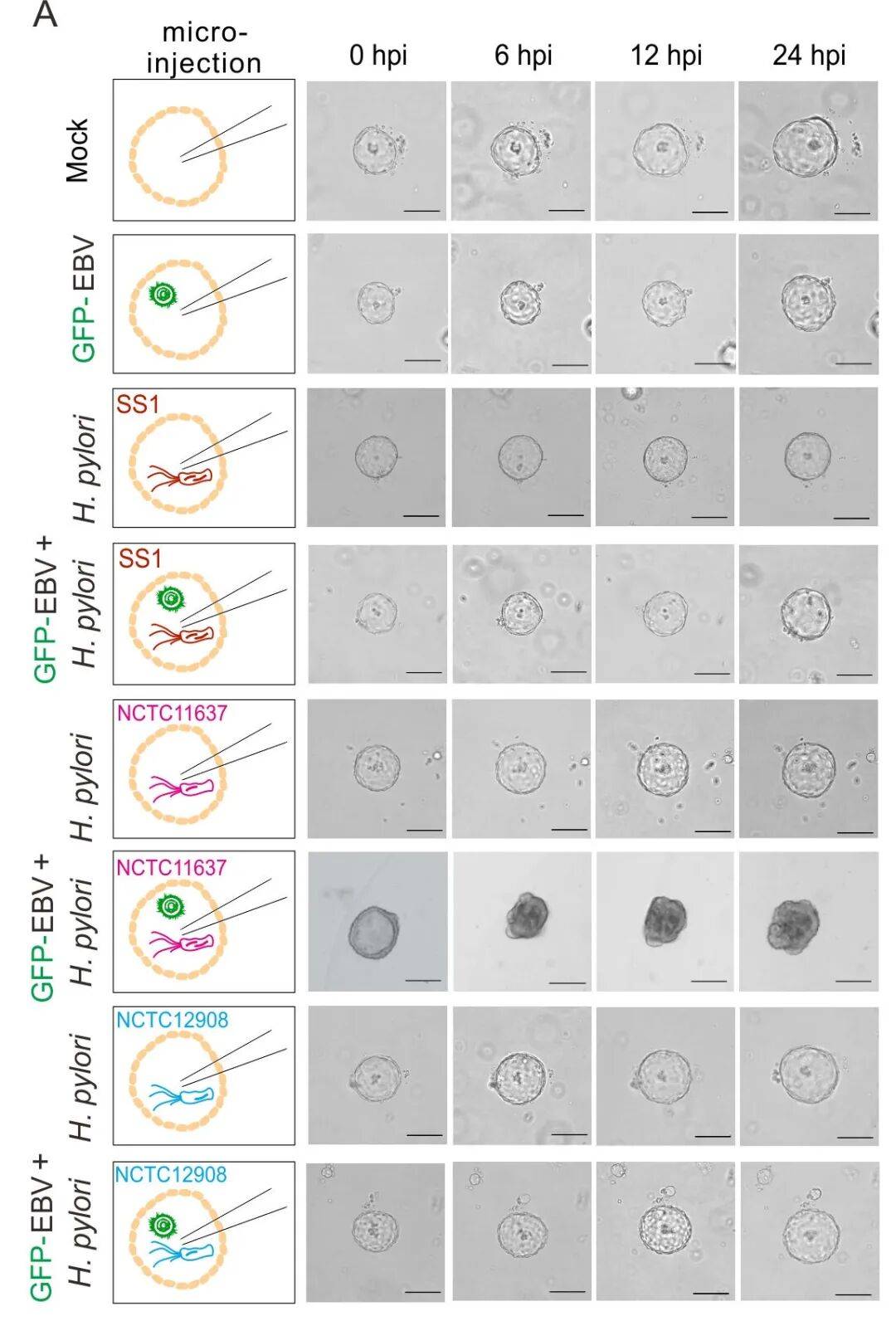 3. 研究H. pylori和EBV共感染对胃类器官的影响:使用微量注射技术,将H. pylori和EBV分别或共同注入胃类器官,观察其对胃类器官形态、生长和细胞周期的影响。