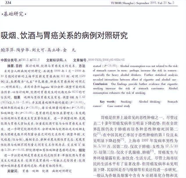 [1]鲍萍萍,陶梦华,刘大可,等.吸烟、饮酒与胃癌关系的病例对照研究[J].肿瘤,2001
