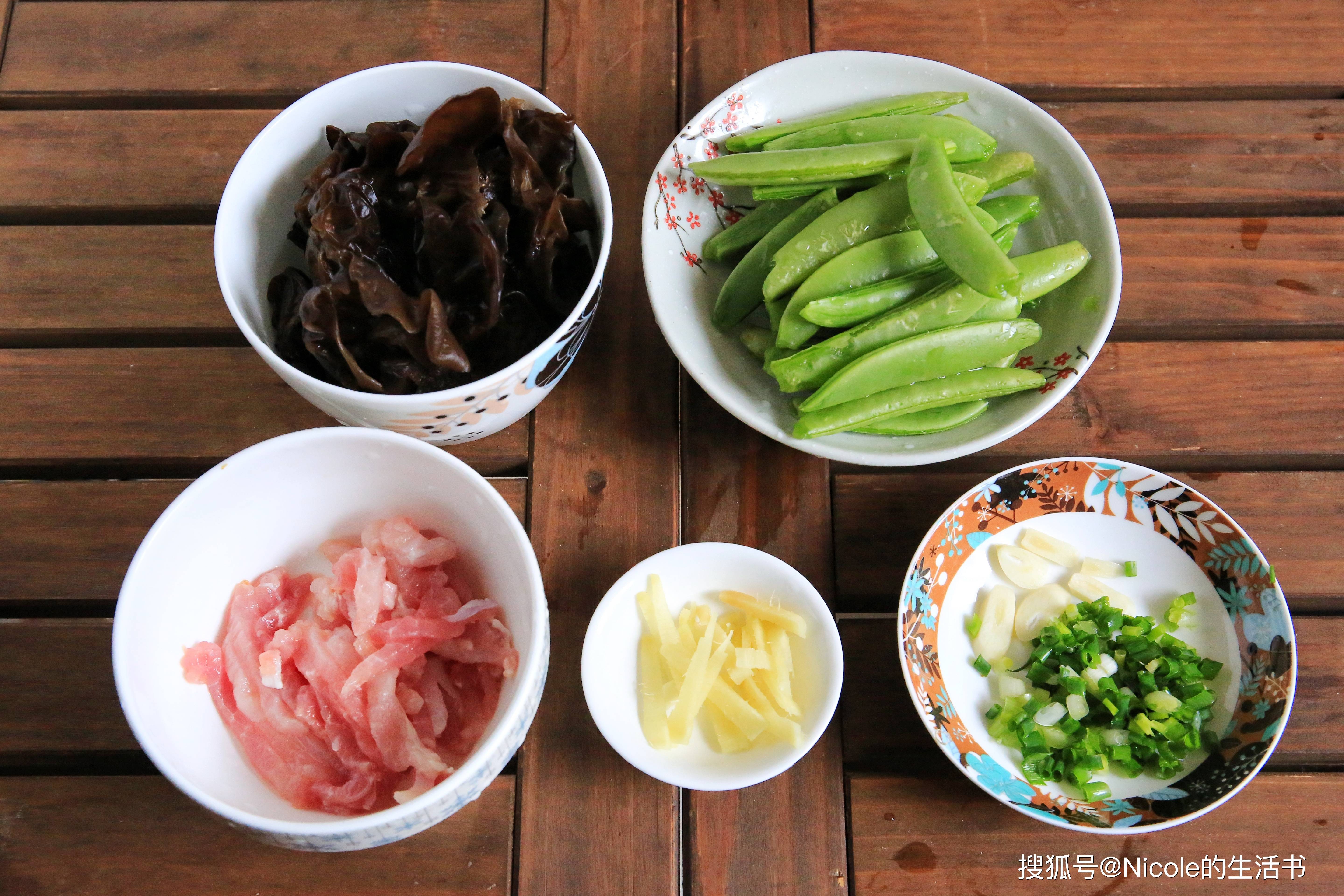 木耳泡发,甜豆荚处理干净,瘦肉切丝,姜切丝,葱蒜切碎