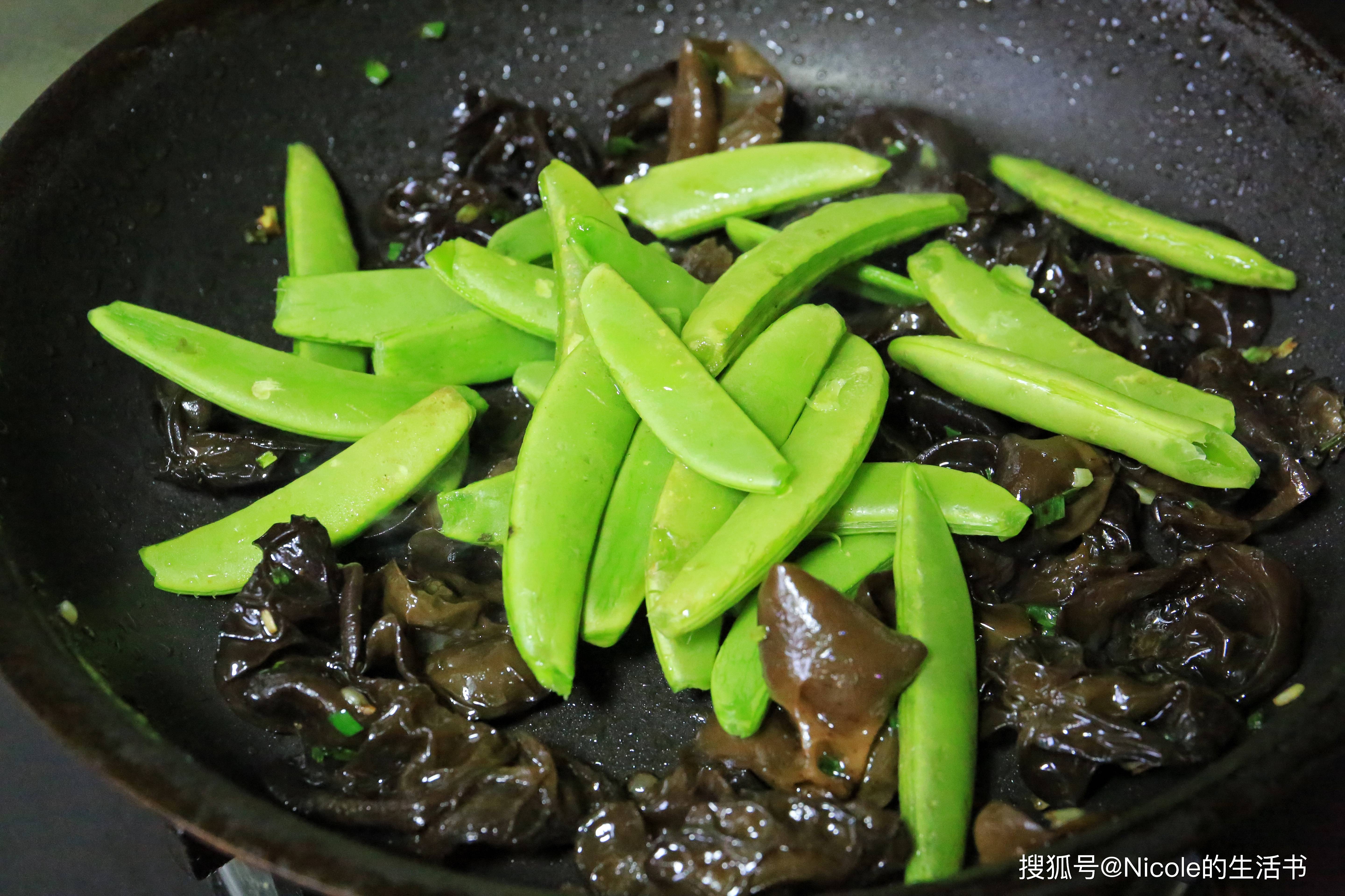 10、再放入甜豆荚,翻炒至木耳变软;