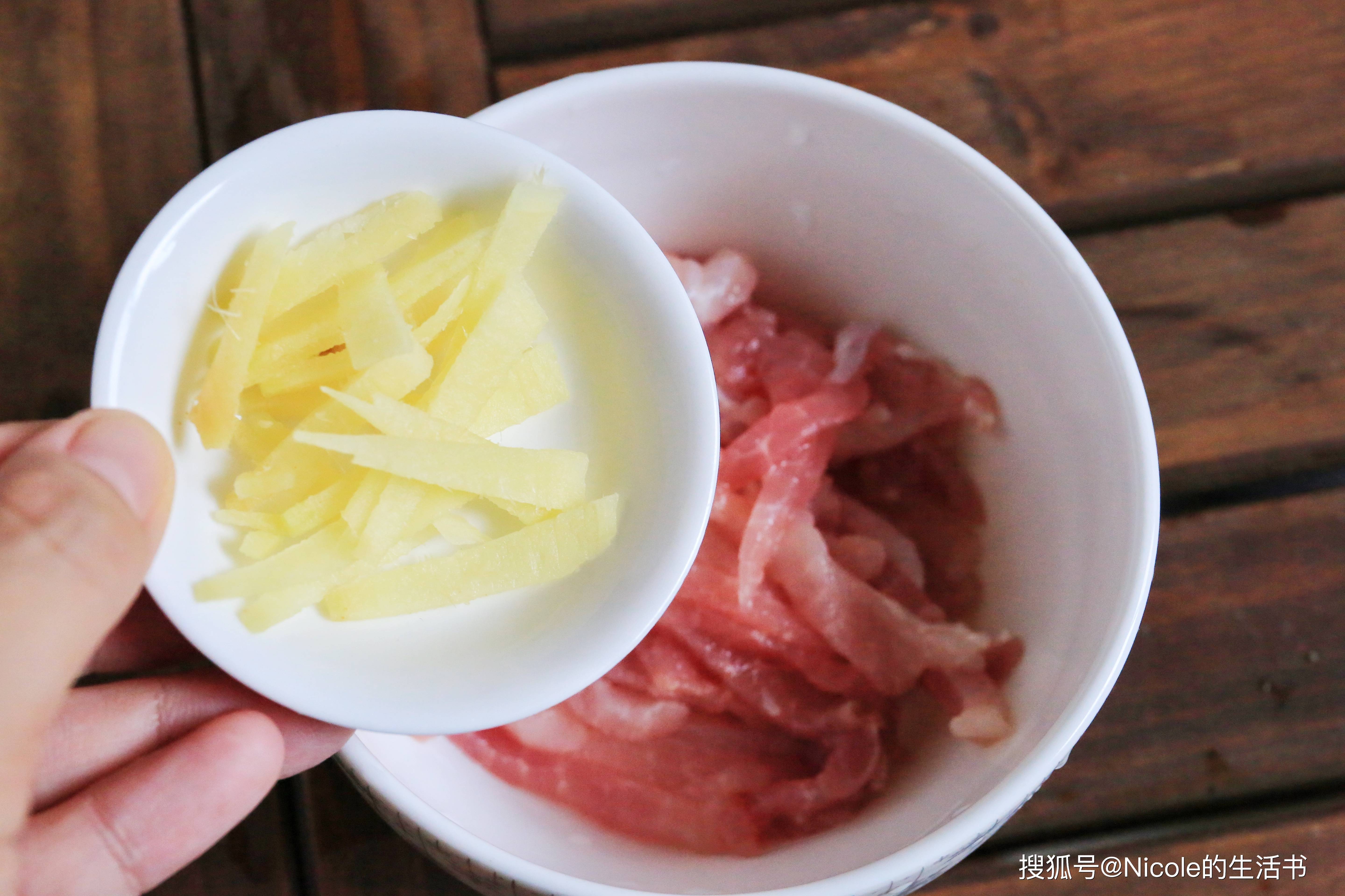 1、姜丝放入肉丝中;