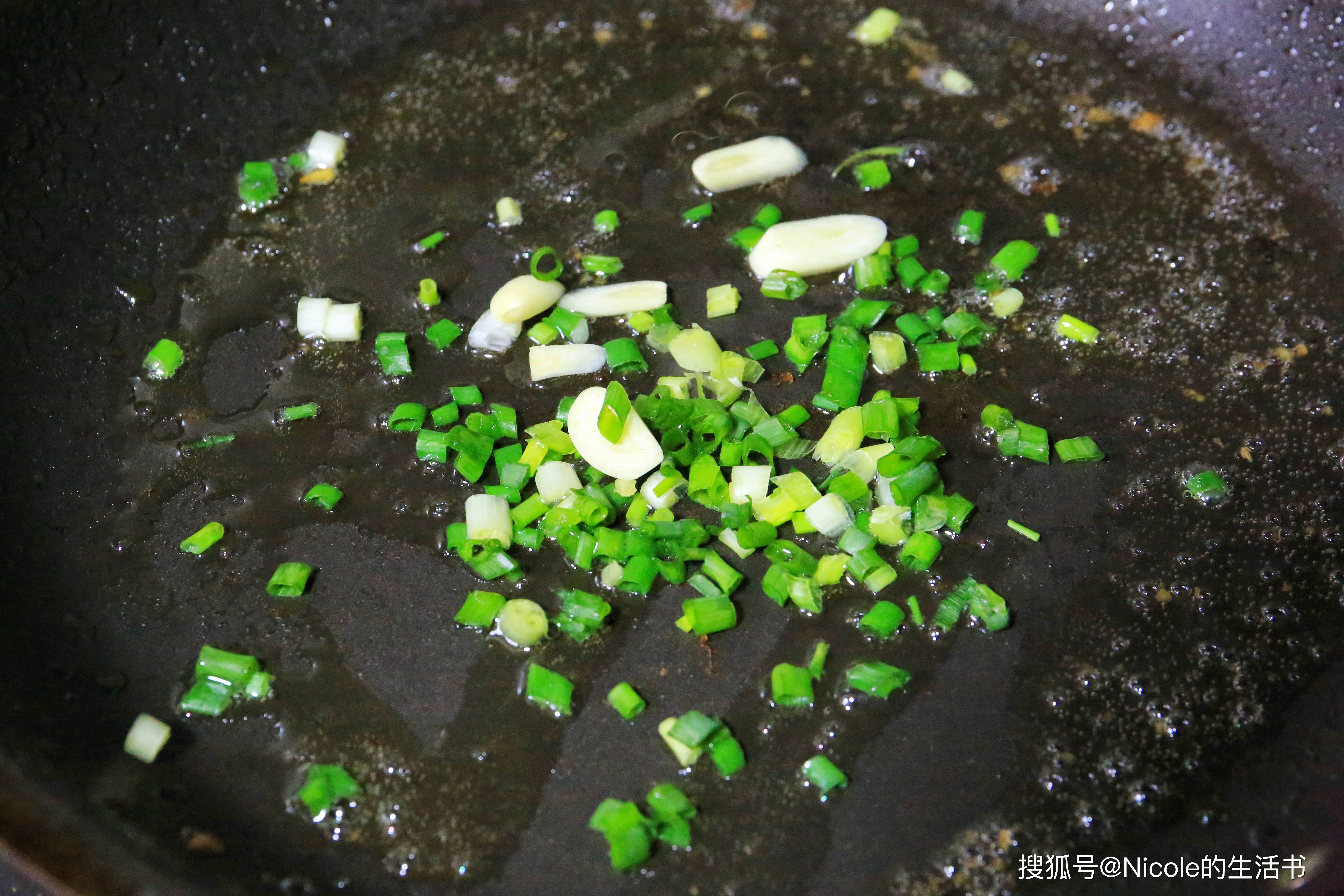 8、留底油,放入葱花和蒜末爆香;